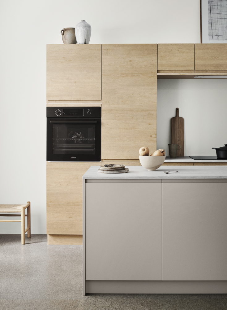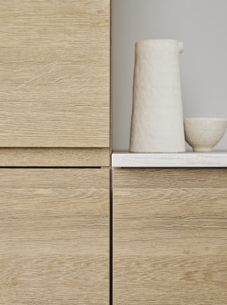 Ariadne Dierick, Marketing Manager Kvik Belgium, précise : "Noliam a été conçue à l'origine en blanc classique. Les nouvelles couleurs apportent une touche de fraîcheur au design. Pour conserver l'aspect élégant et intemporel de la cuisine, nous avons délibérément choisi des tons doux et unis et des matériaux naturels. Il est ainsi possible de combiner les couleurs wood et arizona beige, mais aussi de les utiliser séparément".